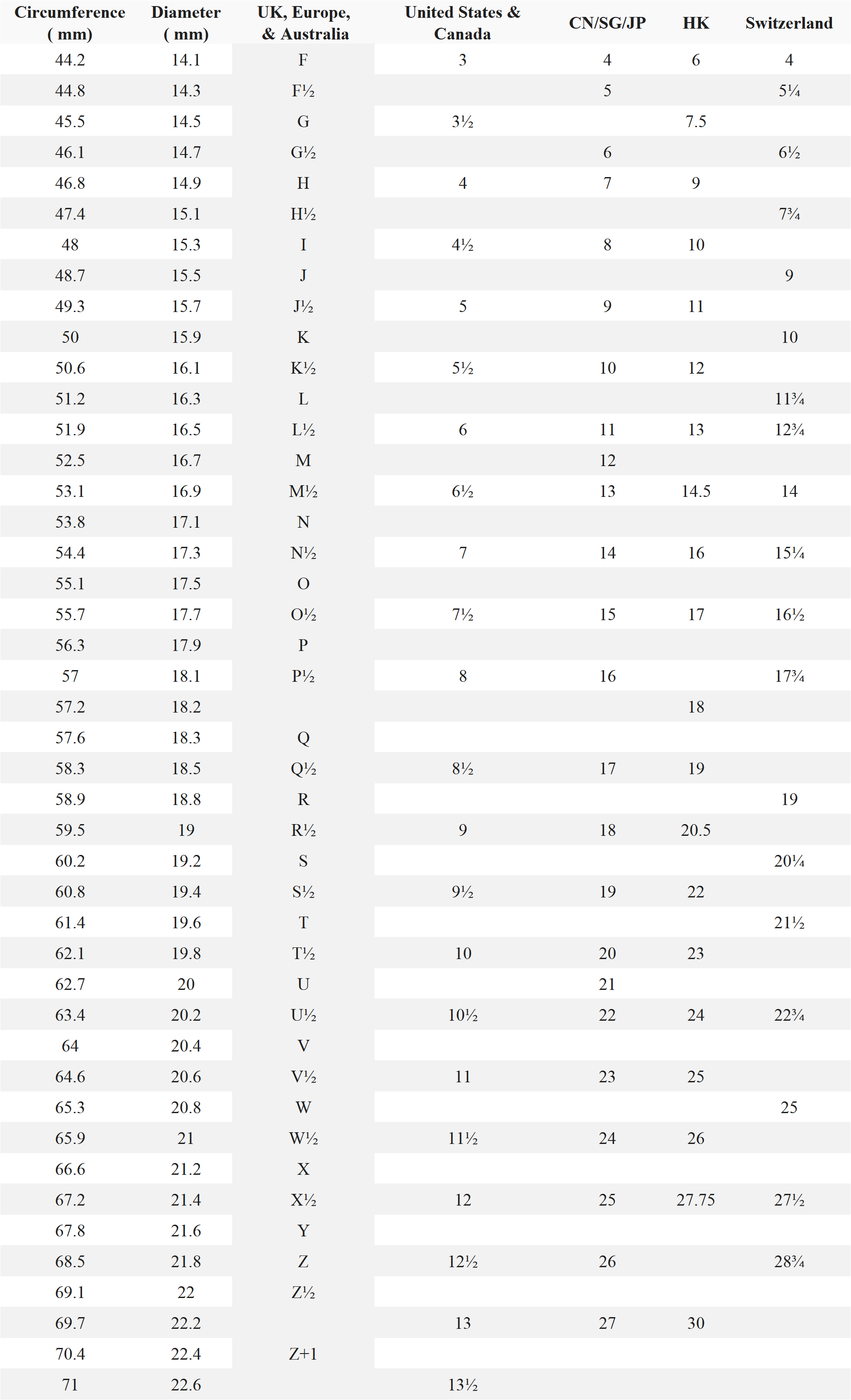 If you already own a ring that fits perfectly on your desired finger, Whether referencing an existing ring or measuring your finger, precision is key. Use the chart below to match your millimeter (mm) measurement—either Diameter or Circumference—to your corresponding United States & Canada size.